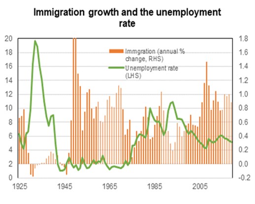 It has been suggested that the sharp decline in the unemployment rate has reflected the lack of immigration. The history of movements in the unemployment rate and immigration if anything indicates the reverse relationship. Of course this time the driver of immigration flows was not economic (the unemployment rate) but government health policy. In that respect the current situation is closer to what happened during World War II, a time when both the unemployment rate and immigration growth was low.