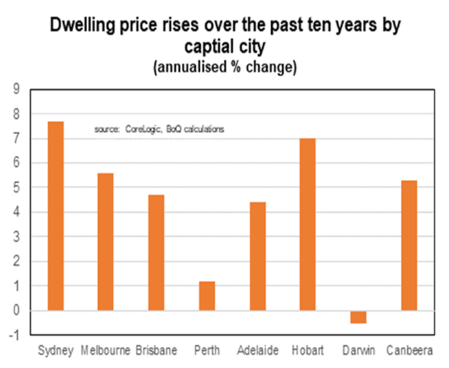 Value and affordability both suggest the Brisbane and Adelaide housing prices may rise by more over the next 2-3 years. The same factors suggest that Sydney and Hobart could have the slowest house price growth. Melbourne and Canberra are likely to be somewhere in-between. The Perth and Darwin housing markets currently offer the best value.