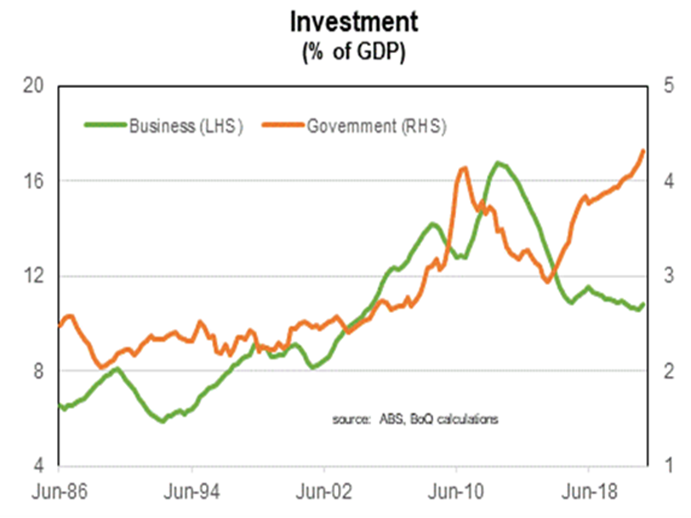 Stronger business investment is unambiguously a good thing. Total investment in the economy (as a proportion of GDP) has been trending down over recent years, one of the causes of slowing productivity growth. The decline of investment has mainly reflected weaker capex spending by firms’. This has been partially offset by stronger Government investment on infrastructure and defence spending.