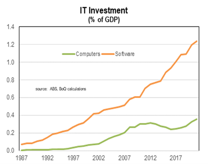 The trend rise in software spending (and IT more generally) has a lot further to run. Software spending in the US is twice as big (relative to the size of GDP) as it is in Australia. Another reason is that the rate of online spending in Australia is less than half of what spent in China and the UK.